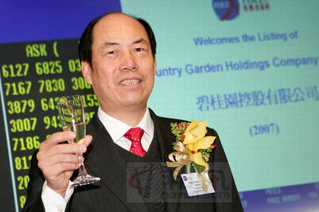 图为:杨国强在挂牌仪式上举杯祝贺碧桂园上市 吸引超过60万香港股民认购的碧桂园(2007.HK)今日在香港联交所挂牌上市,公开招股超购逾200倍,收盘升逾三成,报7.27。这使得持有95.2亿股碧桂园的25岁大股东杨惠妍一举超过玖龙纸业的董事长张茵成为新一代内地女首富,身价约为692.1亿港元。