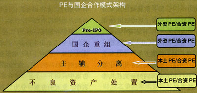 为探寻合理的PE与国企合作模式,笔者将目前活跃于国内资本市场的上百家PE进行了分类,即外资PE(如华平、黑石、凯雷等)、本土PE(如渤海产业、招商局富鑫、中科招商等)、中外合资PE(如鼎晖、弘毅、中信资本等)三种主要类型。同时,也将纷繁复杂的国企资产整合与重组题材,按其资产操作层次的高低,由上至下划分为意欲整体上市(Pre-IPO)、国企与国企之间重组整合、国企内部主辅分离及不良资产处置四个层次。