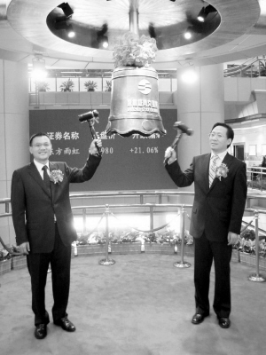东方雨虹董事长李卫国与北京市顺义区区长张延昆(右)共同为公司股票挂牌敲响上市钟声。