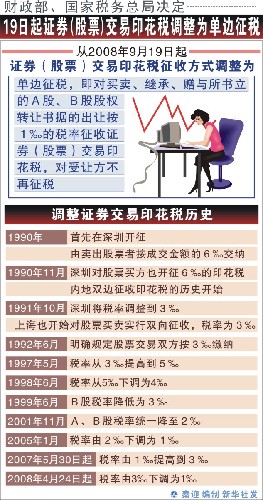 北京9月18日电 经国务院批准,财政部、国家税务总局决定从2008年9月19日起,调整证券(股票)交易印花税征收方式,将现行的对买卖、继承、赠与所书立的A股、B股股权转让书据按千分之一的税率对双方当事人征收证券(股票)交易印花税,调整为单边征税,即对买卖、继承、赠与所书立的A股、B股股权转让书据的出让方按千分之一的税率征收证券(股票)交易印花税,对受让方不再征税。(完)