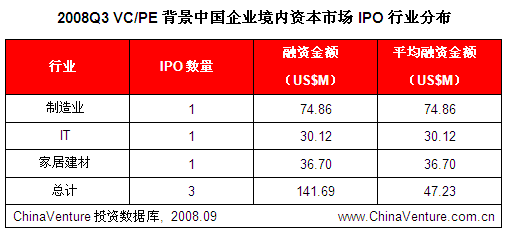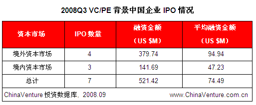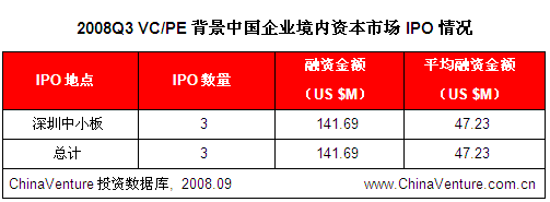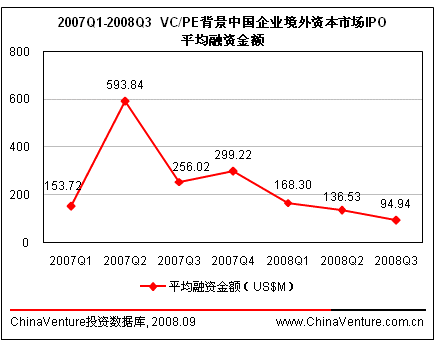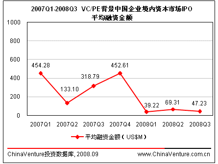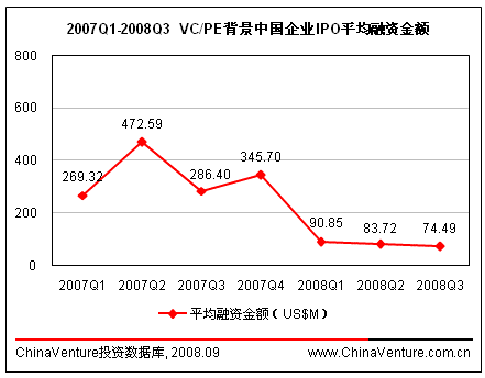 进入2008年以来,VC/PE背景企业IPO平均融资金额呈现出不断下降的趋势,第三季度仅为7449万美元,环比下降11.0%,创2007年以来新低。(见图0-1)