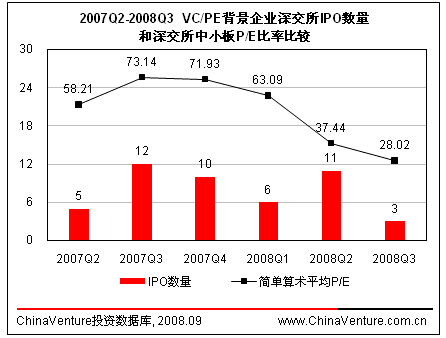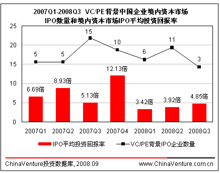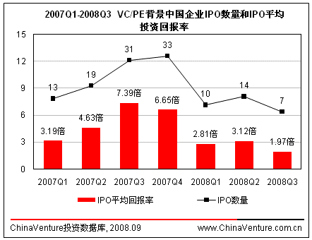 2008年第三季度,境内资本市场VC/PE背景企业IPO平均投资回报率有所回暖,达4.85倍,环比上升23.8%。(见图1.2.5-1)在二级证券市场疲软的情况下,本季度IPO平均回报率能够有所上升主要是出现回报率超高的个案直接拉升了整体水平。现有的市场状况很难给予上市企业较高市盈率,同时投资机构对企业上市前的估值也逐渐降低,企业IPO的投资价值无法得到体现使得市场对于投资者吸引力不断减弱,造成投资者信心缺失。