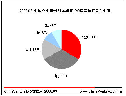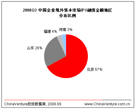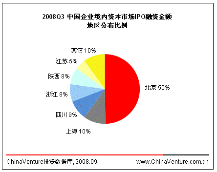 2008年第三季度,境内资本市场IPO企业广泛分布于11个地区。四川企业境内IPO数量大幅增加,占据境内企业IPO数量榜首。(见图1.1.3-1)从融资金额上看,北京所占比例达到境内IPO融资总额50.0%。(见图1.1.3-2)
