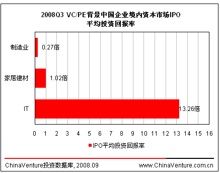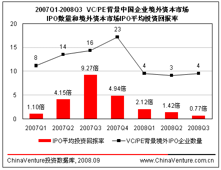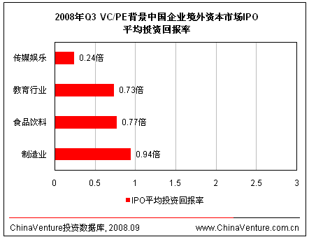 深受次贷、信贷危机的影响,美国IPO市场正在经历急剧的衰退,其影响力波及全球资本市场,整体境外资本市场IPO平均投资回报率进一步下降,跌至2007年以来历史最低点。本季度,VC/PE背景中国企业境外资本市场IPO平均投资回报率仅为0.77倍,环比下降45.8%,同比下降达到91.7%。(图2.2.5-1)三家投资机构支持的正保远程教育在纽交所高增长板上市,其中晨兴创投获得2.27倍回报率,远高于其它两家。