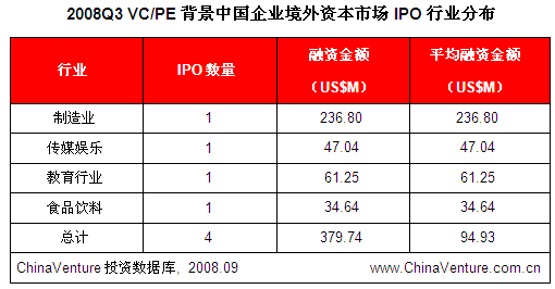 本季度,VC/PE背景中国企业境外资本市场IPO平均分布在制造业、传媒娱乐、教育以及食品饮料等四个行业里。其中,摩根士丹利、鼎晖等机构投资的国内水泥生产龙头企业山水水泥在香港主板IPO,融资18.48亿港元,占VC/PE背景企业境外资本市场IPO总融资金额62.4%。(见表2.2.3-1)山水水泥登陆香港主板旨在迅速融资进行扩张,以应对国内水泥市场的下一步激烈整合。中视金桥作为央视直属企业,此次港股上市进行融资旨在收购策略性资产,补充现有业务,进行内部整合。传媒娱乐、教育等行业能够逆势而行启动IPO计划的主要动力来自于,投资者考虑到未来居民收入的提高会使得消费者将花费更多在中档产品及服务上,传媒娱乐、教育、餐饮等行业将成为最大获益者。因此出于抢占市场加速扩张的目的,海外上市融资成为最佳途径。
