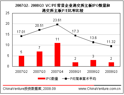 香港主板P/E比率自2007年第四季度以来持续下降,IPO企业数量同样大幅波动,整体规模与去年同期相比有大幅的减少。相比2008年第二季度,本季度香港主板P/E下跌18.5%,跌幅低于2008年第一季度。VC/PE背景中国企业香港主板IPO数量2个,回归2008年第一季度水平。(见图2.2.3-1)