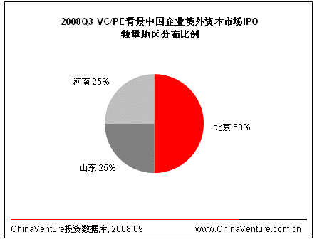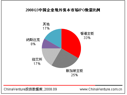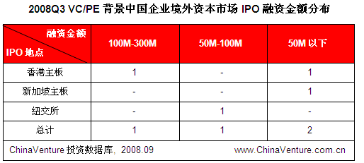2008年第三季度,VC/PE背景中国企业境外资本市场IPO数量、融资金额均有不同程度减少。VC/PE背景境外资本市场IPO数量为4个,环比减少33.3%,同比减少73.3%;融资金额3.80亿美元,环比减少7.3%,同比减少90.7%。从IPO地点上看,境外资本市场IPO企业主要集中于香港主板。(见表2.2-1)值得注意的是,虽然国内二级证券市场的大幅调整影响到香港主板融资规模,IPO数量与融资金额同比环比却均有所下降,但香港主板仍为内地VC/PE进行境外资本市场IPO首选地区。