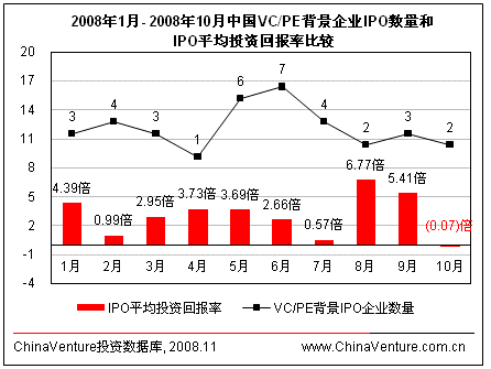 本月仅有1家VC/PE背景企业IPO,融资金额较过去数月有较大回升,达到4.37亿美元,环比上升199.3%(图2-1)。新世界等机构于今年1月投资人和商业,10月正式挂牌,IPO投资回报率为-7.4%,创历史新低(图3-1)。