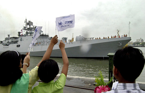 资料照片:停泊在孟买母港的“塔巴尔”号护卫舰,印度在亚丁湾的军事部署,使其海军力量覆盖了整个印度洋。该国正努力实现武装力量的现代化,并计划在海军舰队中添置新的航空母舰和核潜艇。 |