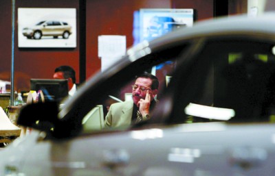 | □金融危机导致美汽车业萧条,汽销人员对前景大为头疼。 CFP本组图片 |