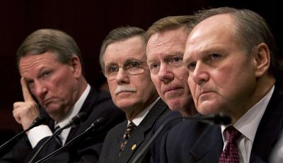 12月4日,美国通用汽车公司总裁兼首席执行官瓦格纳(左一)、美国福特汽车公司总裁兼首席执行官穆拉利(右二)以及美国克莱斯勒公司总裁兼首席执行官纳尔代利(右一)出席美国国会参议院举行的听证会。新华/路透图