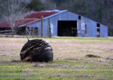 资料图片:失事的哥伦比亚号航天飞机解体后掉落在地上的一块球状残骸。