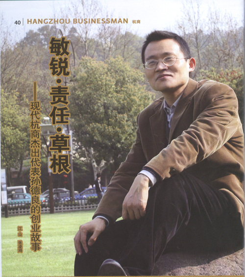敏锐——1995年,杭州计算机用户接入了Internet ,敢于尝螃蟹的人在嘟嘟嘟的拨号声中连接到国际互联网,此时网速是33.6K、一小时收费12元钱。而这一年,孙德良大学毕业。凭借敏锐的嗅觉,他瞄准了互联网。此后的几年中,他自主创业,创建了中国第一家B2B电子商务网站。
