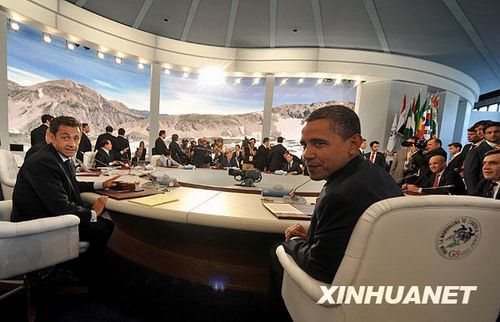 7月8日,在意大利中部城市拉奎拉,美国总统奥巴马(前右)、法国总统萨科齐(前左)等出席八国集团首脑会议。