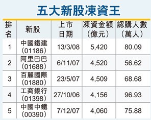 值得留意的是,去年3月“冻资王”中国铁建(01186)冻结资金5,420亿元,破纪录;但于招股首天,孖展额却不足800亿元。若近日资金持续蜂拥金隅,料可打破中铁建的纪录。