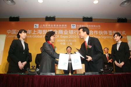 世博网11月18日消息:今天,上海世博会事务协调局与交通银行股份有限公司签订《中国2010年上海世博会商业银行全球合作伙伴协议》,交通银行成为中国2010年上海世博会商业银行全球合作伙伴。届时,交通银行将为这一全球性的博览盛会,提供优质高效的全球化金融服务。至此,2010年上海世博会的合作伙伴已达四家。