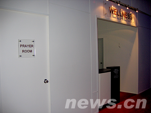 “夏季达沃斯论坛”会场中设置的“祈祷室”(左)和健康驿站。新华网屈绍辉摄