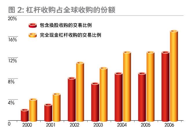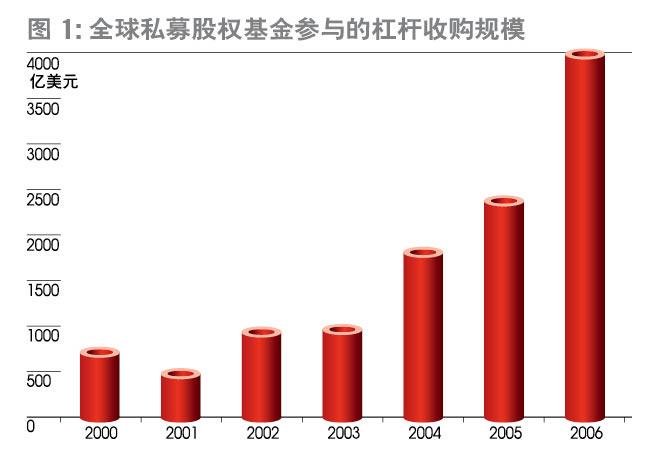 2006年,私募股权投资基金参与的杠杆收购规模占全球并购总额的13%。如果剔除换股交易,PE参与的杠杆收购占现金并购额的17%(图2)。不断壮大的规模与日益大手笔的交易,使得PE完全确立了在华尔街的主流地位。