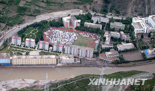 核心提示:首批救援直升机14日上午成功降落此次地震震中汶川县城,记者用海事卫星传回第一张照片。