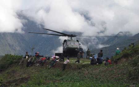 5月14日,乘坐直升机抵达汶川的解放军在搬运救援物资。 新华社记者徐壮志摄
