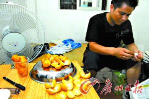 记者根据龚先生的引导,在石溪南约东街附近怀疑有问题的水果档花2.5元买了25个金橘,一个一个剥开来后,发现总共15个里头是有蛆的。蛆虫呈米色,只有不到1厘米长,大都藏在果肉里头,打开果皮后还能看到它在蠕动。有蛆的金橘摸上去都很软,里头的果肉组织往往被虫蛀成一条条小通道。这种蛆金橘个头比较小,有别于之前报道的曾发现蛆虫的那种大柑橘。
