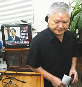 陈水扁昨天下午举行记者会的同时,特侦组主任陈云南也举行记者会,并同步收看电视,了解陈水扁的说法。(图片来源:台湾《联合报》)