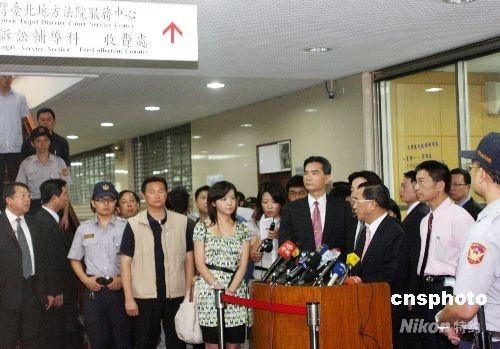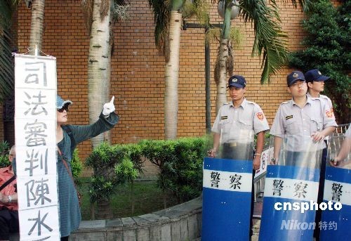 7月21日,台湾前海军中将雷学明等控告陈水扁等人诽谤案在台北地方法院开庭。这是是陈水扁卸任台湾领导人后首度至法院出庭,创下卸任领导人以被告出庭的首例。为此,大批警方出动维持秩序,不过仍发生陈水扁上午在步入法院时遭一民众踹一脚的意外。图为一民众在以盾牌戒备的警察前手持纸牌表达观点。中新社发黄少华 摄