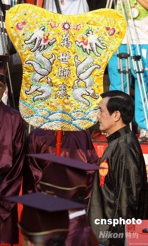 10月5日,台北市政府在孔庙举行纪念孔子诞辰的“释奠典礼”,马英九出席典礼,并上香致意,致赠匾额。 中新社发xiyuhe摄