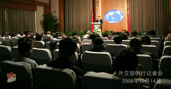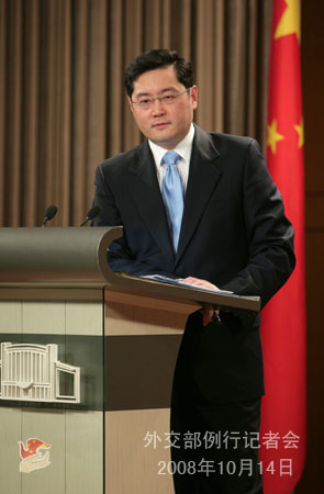 2008年10月14日,外交部发言人秦刚举行例行记者会,主要就巴基斯坦总统访华、六方会谈等答记者问。