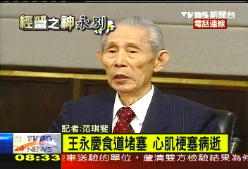 中新网10月16日电据台湾TVBS报道,在台湾有“经营之神”的王永庆先生,惊传病逝,享寿93岁,不过他不是在台湾这块土地离开,而病逝美国新泽西,大体今晚将透过长荣航空运送回台,家属震惊、哀戚。 报道说,王永庆因为担忧美国金融风暴对台湾的冲击,在11日带着夫人和子女前往美国视察旗下的生产线和产房,没想到在美东时间15日早上被送进新泽西一家医院,9点38分因心肺衰竭而过世,享寿93岁。