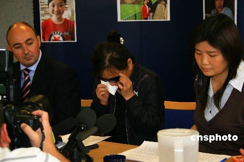 8月上旬,中国留学生杨振兴和他的女友周茜在英国纽卡斯尔的寓所中被残忍杀害。图为当地时间9月18日下午,杨振兴的妈妈曲淑珍(中)在诺森比亚警局泣不成声宣读一份声明,呼吁知情者提供线索。中新社发李鹏 摄