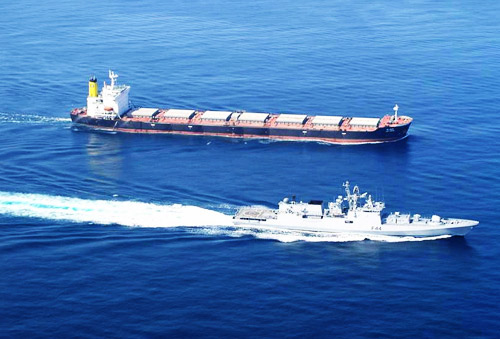 这张由印度海军公布的照片显示,11日,印度海军隐形护卫舰“塔巴尔”号正在护卫索马里海盗试图袭击的印度商船“MV Jag Arnav”号。“塔巴尔”号18日晚在亚丁湾附近击沉一艘索马里海盗“母船”。印度军方说,这艘船的甲板上当时有持枪武装人员活动,船舷上拴有两条快艇,完全符合海盗“母船”特征。 |