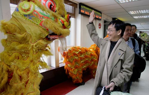 | 12月15日,从深圳起飞的大陆民航班机抵达台北松山机场,这是机场方面舞狮欢迎乘客。 |