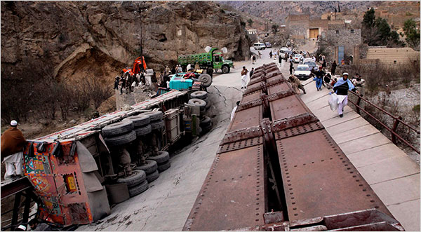 目前,不清楚满载然后和食品等物资的大卡车何时才能重新经卡巴通道进入阿富汗。据悉,80%以上的驻阿富汗北约盟军后勤物资首先被运抵巴基斯坦南部港口卡拉奇,然后再由普通的商业公司承运,沿着陆路北上,最终经卡巴通道抵达阿富汗境内各处,这条后勤“生命线”经常发生塔利班武装伏击运输队事件。 由于桥梁和隧道一直是巴方安全部队重点把守的对象,现在还不清楚,塔利班武装是如何成功炸毁这座重要大桥的。目前,美军需要的燃油40%需要经过这座大桥运输。由于五角大楼已经证实,将向阿富汗增兵数万,各类物资的需求量将因此大增,如何确保后勤补给线的安全将变得十分重要。最新消息称,巴基斯坦工兵已经在被炸毁大桥附近干枯的河床上开辟了一条临时通路,以方便大卡车在天明后继续北上。美军可能经中亚的乌兹别克斯坦和塔吉克斯坦建立新的补给线。现在,美军在上述两个国家内均建有军事基地,它们被视为阿富汗反恐联军的“稳固后方”和“运输基地”。