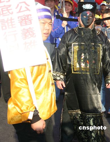 资料图:2005年,在“319”枪击案届满一周年的3月19日,台湾泛蓝阵营在台北举行“319要真相”大游行。图为有人扮成黑脸包公走在游行队伍中。中新社发董会峰 摄 |