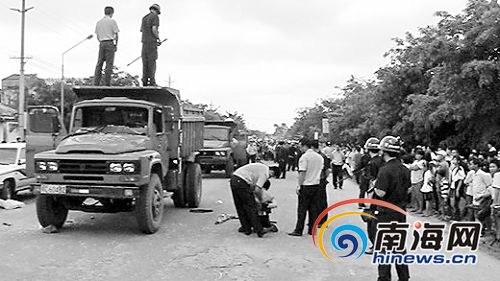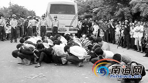 本报临高3月29日电(记者良子摄影报道)两名沙场老板因经营利益问题产生纠纷,双方各组织几十人乘3辆大卡车持长粉枪、长勾刀等凶器欲进行火拼。临高警方得到消息后迅速组织160警力、20余辆警车围追堵截,成功制止了一起聚众斗殴事件,避免了流血事件发生。此次行动,临高警方共查扣违法车辆6部,抓获涉嫌持械斗殴嫌疑人58名。 其中43人被刑拘、12人被行政拘留、3人待查。