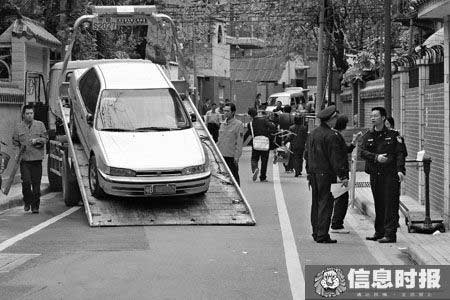 | 一辆停在33号小院的银色本田被拖走。本版摄影 信息时报记者 叶伟报 实习生 戴嘉信 |