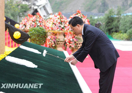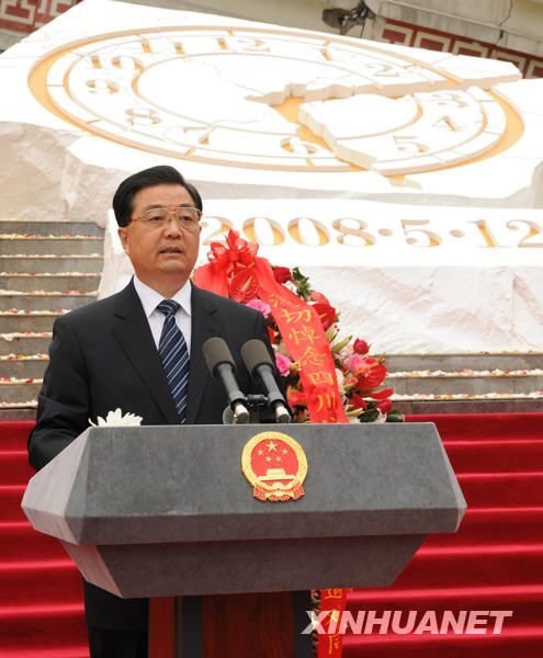5月12日,纪念汶川特大地震一周年活动在四川省汶川县映秀镇隆重举行。中共中央总书记、国家主席、中央军委主席胡锦涛发表重要讲话。新华社记者樊如钧摄