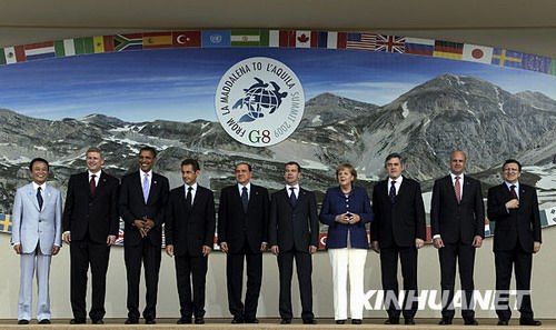 7月8日,在意大利中部城市拉奎拉,日本首相麻生太郎、加拿大总理哈珀、美国总统奥巴马、法国总统萨科齐、意大利总理贝卢斯科尼、俄罗斯总统梅德韦杰夫、德国总理默克尔、英国首相布朗、欧盟轮值主席国瑞典首相赖因费尔特和欧盟委员会主席巴罗佐(从左至右)合影。