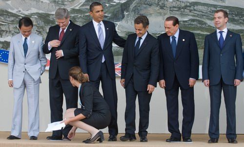 7月8日,八国集团领导人准备合影,(左起)日本首相麻生太郎、加拿大总理哈珀、美国总统奥巴马、法国总统萨科齐、意大利总理贝卢斯科尼、俄罗斯总统梅德韦杰夫
