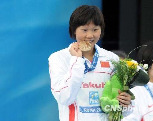 罗马时间7月30日晚上,罗马游泳世锦赛女子50米仰泳颁奖仪式上中国夺金选手赵菁试咬金牌。当日,赵菁以27秒06的成绩获得冠军,并打破世界纪录。这是中国选手在本次游泳锦标赛上获得的第二块金牌,打破的第二个世界纪录。中国另一名选手高畅也不负众望,她以27秒28获得第三名。 中新社发 廖攀 摄