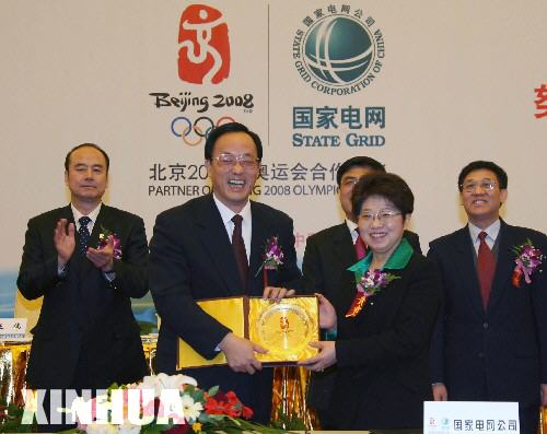 2006年1月26日,北京市副市长、北京奥组委执行副主席刘敬民(左二)代表北京奥组委向国家电网公司副总经理陈月明赠送纪念品。当日,北京奥组委与国家电网公司在京签署合作协议,国家电网公司成为北京2008年奥运会电力供应合作伙伴。新华社记者孟永民摄