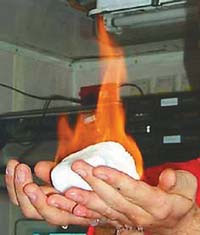 天然气水合物存在于海底或陆地冻土带内,是由天然气与水在高压低温条件下结晶形成的固态笼状化合物。纯净的天然气水合物呈白色,形似冰雪,可以像固体酒精一样直接被点燃,因此,又被称为“可燃冰”。