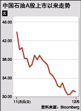 从11月5日上市首日均价45.09元算起,一个月内中国石油跌幅达到了30%。不管是首日介入者,还是下跌中途抢反弹者,过去一个月内,中国石油的投资者几乎悉数被套。