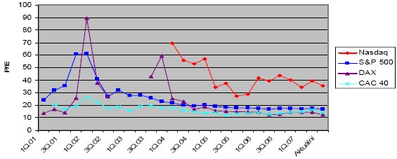 2)美国3大股指和法国CAC40指数的市盈率比较图