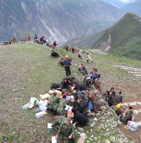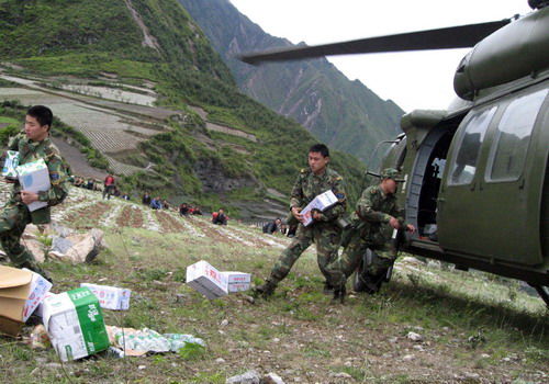 5月14日,乘坐直升机抵达汶川的解放军在搬运救援物资。 新华社记者徐壮志摄