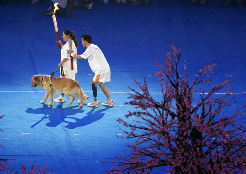 中国首枚残奥会金牌获得者平亚丽(右)手牵导盲犬在“鸟巢”内传递火炬。