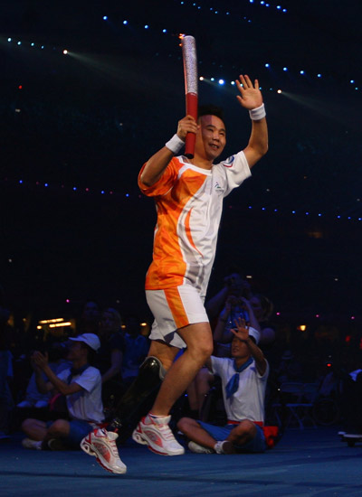 2008年9月6日晚残奥会开幕式,火炬传递到主体育场(鸟巢),天津著名残疾人选手、巴塞罗那标枪金牌获得者孙长亭作为倒数第三个火炬手传递火炬。当神采奕奕的孙长亭跑到倒数第二名火炬手、为我国获得首枚残奥会金牌的盲人运动员平亚丽面前点燃后者手中火炬时,意外发生了,平亚丽手中的火炬很长时间都没有点燃,全场观众全都目瞪口呆。只见孙长亭将自己的火炬和平亚丽的火炬进行了交换,拍拍平亚丽的肩膀,示意她可以传递了,平亚丽牵着导盲犬顺利地完成了传递。