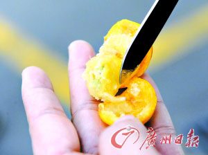 记者根据龚先生的引导,在石溪南约东街附近怀疑有问题的水果档花2.5元买了25个金橘,一个一个剥开来后,发现总共15个里头是有蛆的。蛆虫呈米色,只有不到1厘米长,大都藏在果肉里头,打开果皮后还能看到它在蠕动。有蛆的金橘摸上去都很软,里头的果肉组织往往被虫蛀成一条条小通道。这种蛆金橘个头比较小,有别于之前报道的曾发现蛆虫的那种大柑橘。